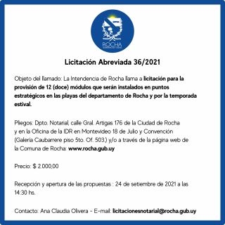 14-09-2021 Licitación Abreviada 36/2021 Objeto del llamado: La Intendencia de Rocha llama a licitación para la provisión de 12 (doce) módulos que serán instalados en puntos estratégicos en las playas del departamento de Rocha y por la temporada estival. Pliegos: Dpto. Notarial, calle Gral. Artigas 176 de la Ciudad de Rocha y en la Oficina de la IDR en Montevideo 18 de Julio y Convención (Galería Caubarrere piso 5to. Of. 503.) y/o a través de la página web de la Comuna de Rocha: www.rocha.gub.uy Precio: $ 2.000,00 Recepción y apertura de las propuestas : 24 de setiem (...)