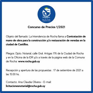 14-09-2021 Concurso de Precios 1/2021 Objeto del llamado: La Intendencia de Rocha llama a Contratación de mano de obra para la construcción y/o restauración de veredas en la ciudad de Castillos. Pliegos: Dpto. Notarial, calle Gral. Artigas 176 de la Ciudad de Rocha y en la Oficina de la IDR y/o a través de la página web de la Comuna de Rocha: www.rocha.gub.uy Recepción y apertura de las propuestas : 17 de setiembre de 2021 a las 15:00 hs. Contacto: Ana Claudia Olivera- E-mail: licitacionesnotarial@rocha.gub.uy (...)