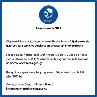 14-09-2021 Concesión 1/2021 Objeto del llamado: La Intendencia de Rocha llama a Adjudicación de quioscos para servicios de playas en el departamento de Rocha. Pliegos: Dpto. Notarial, calle Gral. Artigas 176 de la Ciudad de Rocha y en la Oficina de la IDR y/o a través de la página web de la Comuna de Rocha: www.rocha.gub.uy Recepción y apertura de las propuestas : 24 de setiembre de 2021 a las 18:00 hs. Contacto: Ana Claudia Olivera- E-mail: licitacionesnotarial@rocha.gub.uy (...)