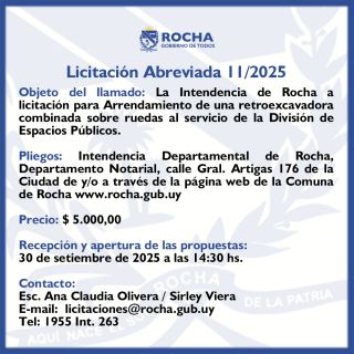 19-09-2025 Licitación Abreviada 11/2025 Objeto del llamado: La Intendencia de Rocha a licitación para Arrendamiento de una retroexcavadora combinada sobre ruedas al servicio de la División de Espacios Públicos. Pliegos: Intendencia Departamental de Rocha, Departamento Notarial, calle Gral. Artigas 176 de la Ciudad de y/o a través de la página web de la Comuna de Rocha www.rocha.gub.uy Precio: $ 5.000,00 Recepción y apert (...)