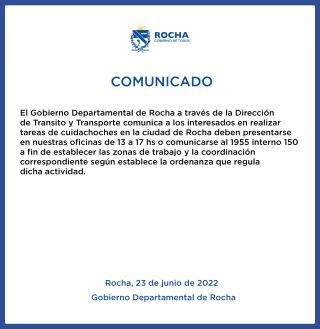 23-06-2022 El Gobierno Departamental de Rocha a través de la Dirección de Transito y Transporte comunica a los interesados en realizar tareas de cuidachoches en la ciudad de Rocha deben presentarse en nuestras oficinas de 13 a 17 hs o comunicarse al 1955 interno 150 a fin de establecer las zonas de trabajo y la coordinación correspondiente según establece la ordenanza que regula dicha actividad. (...)