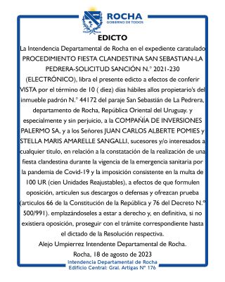 28-08-2023 EDICTO. La Intendencia Departamental de Rocha en el expediente caratulado PROCEDIMIENTO FIESTA CLANDESTINA SAN SEBASTIAN-LA PEDRERA-SOLICITUD SANCIÓN N.° 2021-230 (ELECTRÓNICO), libra el presente edicto a efectos de conferir VISTA por el término de 10 ( diez) días hábiles allos propietario's del inmueble padrón N.° 44172 del paraje San Sebastián de La Pedrera, departamento de Rocha, República Oriental del Uruguay. y especialmente y sin perjuicio, a la COMPAÑÍA DE INVERSIONES PALERMO SA, y a los Señores JUAN CARLOS ALBERTE POMIES y STELLA MARIS AMARELLE SANGALLI, sucesores y/o interesados (...)