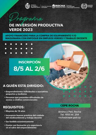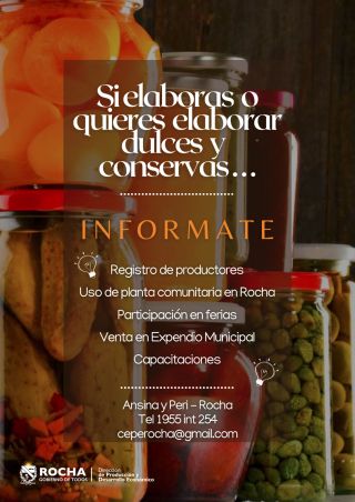 16-05-2023 Acérquese!! Si Usted produce o quiere comenzar a producir dulces y conservas queremos conocer sus inquietudes. Para eso la Dirección de Producción Y Desarrollo Económico está realizando un relevamiento. Lo invitamos a informarse y registrarse. Posibilidades de Uso de Planta de elaboración comunitaria, capacitaciones, participación en ferias, ventas a expendio municipal, entre otras. Información a través del tel 1955 interno 254, mail:ceperocha@gmail.com o directamente en calle Ansina esq. Peri de ciudad de Rocha (...)