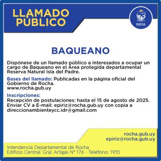 07-08-2025 LLAMADO PUBLICO BAQUEANO EL INTENDENTE DEPARTAMENTAL DE ROCHA RESUELVE: 1º.- Dispónese un llamado público a interesados a ocupar un (1) cargo de Baqueano en el Área Protegida Reserva Natural Isla del Padre.- 2°. Los postulantes deberán tener el siguiente perfil: A) Ser mayores de 18 años. B) Se dará prioridad a los postulantes que sean residentes en Cebollatí, se considerarán cercanías al área protegida. C) Deberá tener habilidades y destrezas para realizar tareas de campo. D) Tener disponibilidad de periodos largos en el lugar de trabajo (4 d (...)