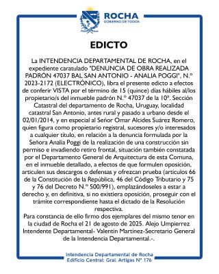 28-08-2025 EDICTO La INTENDENCIA DEPARTAMENTAL DE ROCHA, en el expediente caratulado "DENUNCIA DE OBRA REALIZADA PADRÓN 47037 BAL SAN ANTONIO - ANALIA POGGI", N.º 2023-2172 (ELECTRÓNICO), libra el presente edicto a efectos de conferir VISTA por el término de 15 (quince) días hábiles al/los propietario/s del inmueble padrón N.º 47037 de la 10ª. Sección Catastral del departamento de Rocha, Uruguay, localidad catastral San Antonio, antes rural y pasado a urbano desde el 02/01/2014, y en especial al Señor Omar Alcides Suárez Romero, quien figura como propietario registral, sucesores y/o interesado (...)