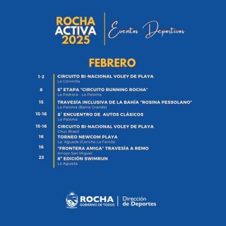 03-02-2025 En el marco de la 5ª Edición del Programa “Rocha Activa” compartimos calendario de eventos deportivos correspondientes al mes de febrero. La Dirección de Deportes continúa trabajando en el desarrollo, descentralización y democratización del deporte para el progreso de nuestro departamento. (...)