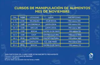 22-08-2017 ROCHA Ciudad. DÍA: LUNES 11 De Septiembre de 2017 HORA: 9:00 LUGAR: TEATRO 25 DE MAYO No requiere inscripción previa. No tiene costo Vigencia 3 años Consultas al teléfono 1955 internos 139 y 178. bromatologia@rocha.gub.uy bromatologiarocha@gmail.com (...)