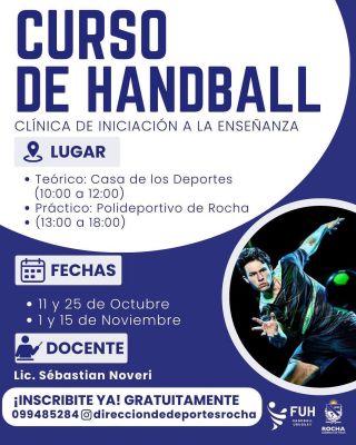 02-10-2025 La Federación Uruguaya de Handball junto a la Dirección de Deportes de Rocha invitan a participar de la Clínica de Handball que se desarrollará en el departamento de Rocha. Fechas: • Sábado 11 de octubre de 2025 • Sábado 25 de octubre de 2025 • Sábado 1.º de noviembre de 2025 • Sábado 15 de noviembre de 2025 Sedes y horarios: • Teórico: de 10:00 a 12:00 horas en la Casa de los Deportes • Práctico: de 13:00 a 18:00 horas en el Polideportivo de Rocha Docente: Lic. Sebastián (...)