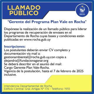29-01-2025 Llamado Abierto para el cargo de "Gerente del Programa Plan Vale en Rocha", para liderar los programas de recuperación de envases en el Departamento de Rocha cuyas bases y condiciones están publicadas al pie de esta publicación. Los postulantes deberán enviar CV completo y documentación via mail a: gestionambiental@rocha.gub.uy,con copia a alejandra@fundacionaganar.org Se deberá describir en el asunto del mail:Cargo Gerente Plan Vale-Rocha. Vigencia de la postulación, hasta el 7 de febrero de 2025 inclusive. (...)