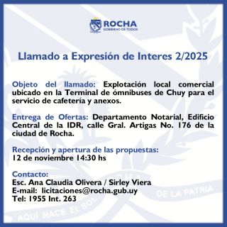 29-10-2025 LLAMADO A EXPRESION DE INTERES 2/2025 Objeto del llamado: Explotación local comercial ubicado en la Terminal de ómnibuses de Chuy para el servicio de cafetería y anexos. Entrega de Ofertas: Departamento Notarial, Edificio Central de la IDR, calle Gral. Artigas No. 176 de la ciudad de Rocha. Recepción y apertura de las propuestas: 12 de noviembre 14:30 hs Contacto: