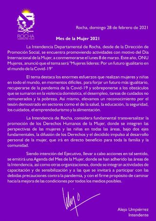 02-03-2021 Mensaje del Dr.Alejo Umpiérrez, Intendente de Rocha con motivo de la conmemoración en el mes de Marzo de la reivindicación de los derechos de la Mujer. En este mes se cumplirá con una extensa agenda de actividades que estaremos detallando. Ofrecemos el mensaje del Gobierno Departamental en tal sentido. (...)