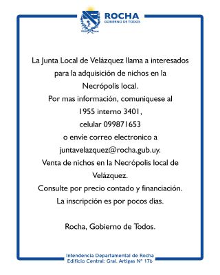 06-09-2022 La Junta Local de Velázquez llama a interesados para la adquisición de nichos en la Necrópolis local. Por mas información, comuniquese al 1955 interno 3401, celular 099871653 o envíe correo electronico a juntavelazquez@rocha.gub.uy. Venta de nichos en la Necrópolis local de Velázquez. Consulte por precio contado y financiación. La inscripción es por pocos dias. Rocha, Gobierno de Todos. (...)