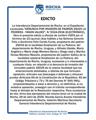 10-06-2025 La Intendencia Departamental de Rocha, en el Expediente caratulado "DENUNCIA POR INVASIÓN DE PADRÓN 25025 LA PEDRERA - YANON VALDEZ", N.º2024-2938 (ELECTRÓ (...)