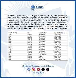 05-08-2025 La Intendencia de Rocha, da vista por el plazo de 10 días, a los propietarios, sucesores a cualquier títulos, ocupantes y/o poseedores a cualquier título de los padrones que se indican a continuación, de la resolución del Gobierno Departamental de Rocha dictada en el expediente administrativo correspondiente, respecto a las deudas que mantienen a la fecha por concepto de Tributos Inmobiliarios. Los mencionados expedientes se encuentran disponibles en la Dirección General de Secretaría.- (...)