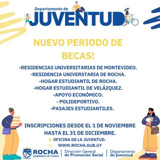 04-11-2024 ‼️COMIENZA NUEVO PERIODO DE INSCRIPCIÓN A BECAS. 💬A partir de hoy, hasta que 31 de diciembre, queda habilitado un nuevo periodo de inscripción a las becas proporcionadas por la Intendencia Departamental de Rocha, a través del Departamento de Juventud. 📌 Residencias Universitarias, Hogares Estudiantiles, y Becas de Apoyo Económico para Enseñanza Media e IFD, serán las becas que podrán inscribirse los estudiantes de nuestro Departamento. 👩💻La inscripción a las mismas será a través del la página web del gobierno de rocha, en la Oficina de la Juventud de Rocha, y en (...)