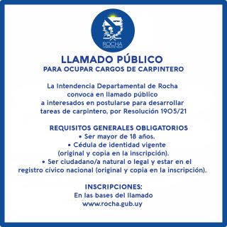 15-09-2021 LLAMADO PÚBLICO PARA OCUPAR CARGO DE CARPINTERO La Intendencia Departamental de Rocha convoca en llamado público a interesados en postularse para desarrollar tareas de CARPINTERO, por Resolución 1905/21.