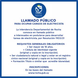 15-09-2021 LLAMADO PÚBLICO PARA OCUPAR CARGO DE ELECTRICISTA La Intendencia Departamental de Rocha convoca en llamado público a interesados en postularse para desarrollar tareas de ELECTRICISTA, por Resolución 1903/21.