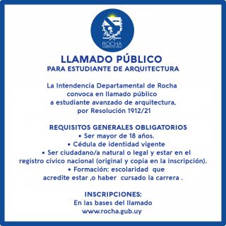 15-09-2021 LLAMADO PÚBLICO PARA ESTUDIANTE AVANZADO EN ARQUITECTURA La Intendencia Departamental de Rocha convoca en llamado público a interesados en postularse para desarrollar tareas en ARQUITECTURA, por Resoluci&oac (...)