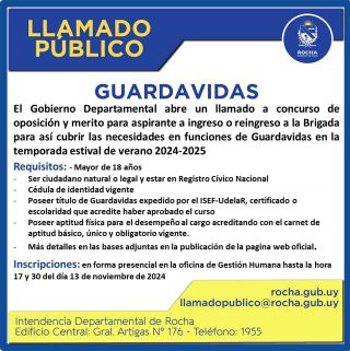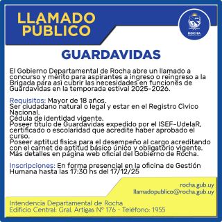 09-12-2025 El Gobierno Departamental de Rocha abre un llamado a concurso y mérito para aspirantes a ingreso o reingreso a la Brigada para asì cubrir las necesidades en funciones de Guardavidas en la temporada estival 2025-2026. Requisitos: Mayor de 18 años. Ser ciudadano natural o legal y estar en el Registro Cìvico Nacional. Cédula de identidad vigente. Poseer título de Guardavidas expedido por el ISEF-UdelaR, certificado o escolaridad que acredite haber aprobado el curso. Poseer aptitud fisica para el desempeño al cargo acreditando con el carnet de aptitud básico único y obligatorio v (...)
