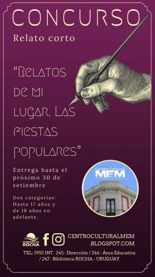 27-07-2020 Concurso Departamental del Centro Cultural “María Élida Marquizo” 2020 “Relatos de mi lugar. Las fiestas populares” BASES 1- Podrán participar ciudadanos uruguayos o extranjeros residentes o no en el Departamento de Rocha. 2- Se participará en dos categorías: a) Hasta 17 años. b) De 18 años en adelante. 3- El producto a ser presentado es un relato corto, de no más de 3 carillas, que referenciará historias, personajes, anécdot (...)