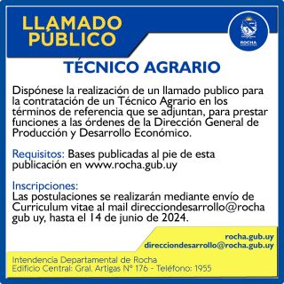 03-06-2024 1°) Dispónese la realización de un llamado publico para la contratación de un Técnico Agrario en los términos de referencia que se adjuntan, para prestar funciones a las órdenes de la Dirección General de Producción y Desarrollo Económico, 2") Las postulaciones se realizarán mediante envío de Curriculum vitae al mail direcciondesarrollo@rocha gub uy, hasta el 14 de junio de 2024; 3°) Regístrese, pase para su conocimiento y p (...)