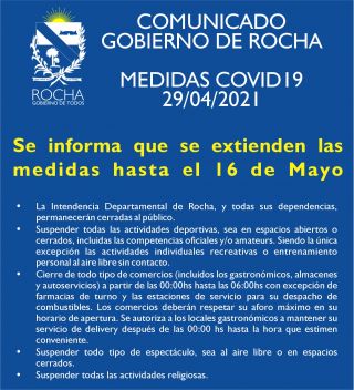 07-05-2021 De acuerdo a las medidas tomadas por el Poder Ejecutivo de nuestro país, se amplían las medidas por la Pandemia de Covid-19 en idénticas condiciones hasta el próximo 16 de mayo. El Gobierno departamental continúa atendiendo al público por via telefónica o virtual y estaremos informando las vias de comunicación y las oficinas que lo atenderán. (...)