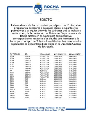 18-01-2024 EDICTO La Intendencia de Rocha, da vista por el plazo de 10 días, a los propietarios, sucesores a cualquier títulos, ocupantes y/o poseedores a cualquier título de los padrones que se indican a continuación, de la resolución del Gobierno Departamental de Rocha dictada en el expediente administrativo correspondiente, respecto a las deudas que mantienen a la fecha por concepto de Tributos Inmobiliarios. Los mencionados expedientes se encuentran disponibles en la Dirección G (...)