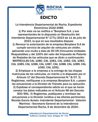 07-01-2025 EDICTO La Intendencia Departamental de Rocha, Expediente Electrónico 2022-3085 1) Por esta vía se notifica a "Bonplace S.A. y sus representantes de lo dispuesto en Resolución del Intendente Departamental N° 1771/2023 de 11 de julio de 2023, la que en sus resultados dispuso 1) Revocar la autorización de la empresa Bonplace S.A de cumplir servicio de alquiler de vehículos sin chófer, aplicando una multa a ésta de 50 UR (Cincuenta Unidades Reajustables) y del 100% del valor del Impuesto de Patente de Rodados de los vehículos que se dirán a continuación: MATRÍCULAS CAL 1080, CAL 1081, CAL 1082, CAL 1083, (...)