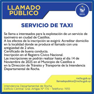29-10-2025 Visto la Resolución de el Intendente Departamental de Rocha N° 000818/2025 de fecha 23 de abril de 2025 con la anuencia de la Junta Departamental según resolución 53/2025, se dispone: Se llama a interesados para la explotación de un servicio de taxímetro en ciudad de Castillos.- A los efectos de la inscripción se exigirá: Acreditar domicilio en la localidad donde se produce el llamado con una antigüedad de 2 años. Certificado de buena conducta Inscripción en el registro cívico nacional.- Las inscripciones se podrán realizar hasta el día 14 (...)