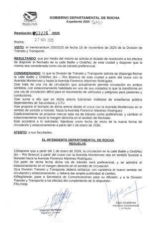 02-12-2025 Rocha fija nuevo sentido de circulación en la calle Batlle y Ordóñez a partir del 1° de enero de 2026 El Gobierno Departamental de Rocha emitió la Resolución Nº 33226/2025, mediante la cual se establece un cambio significativo en la circulación vehicular de la calle Batlle y Ordóñez (ex Río Branco), atendiendo a una solicitud de la División de Tránsito y Transporte. El cambio comenzará a regir e (...)
